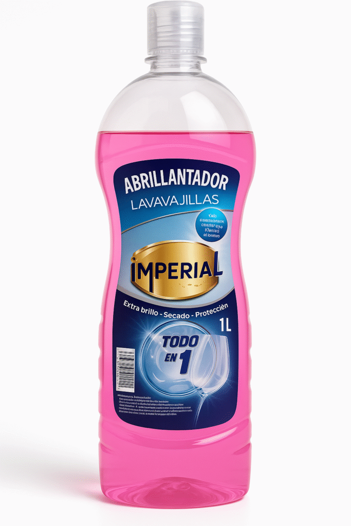 abrillantador para máquinas lavavajillas. Está compuesto por una mezcla de tensioactivos que rebajan la tensión superficial descomponiendo los iones de cal y magnesio del agua dejando un acabado brillante en la superficie de la vajilla. Los polímeros específicos hacen de él un detergente de espuma controlada y alto rendimiento, al escurrir perfectamente el agua acelerando el tiempo de secado, eliminando los residuos sobre la superficie